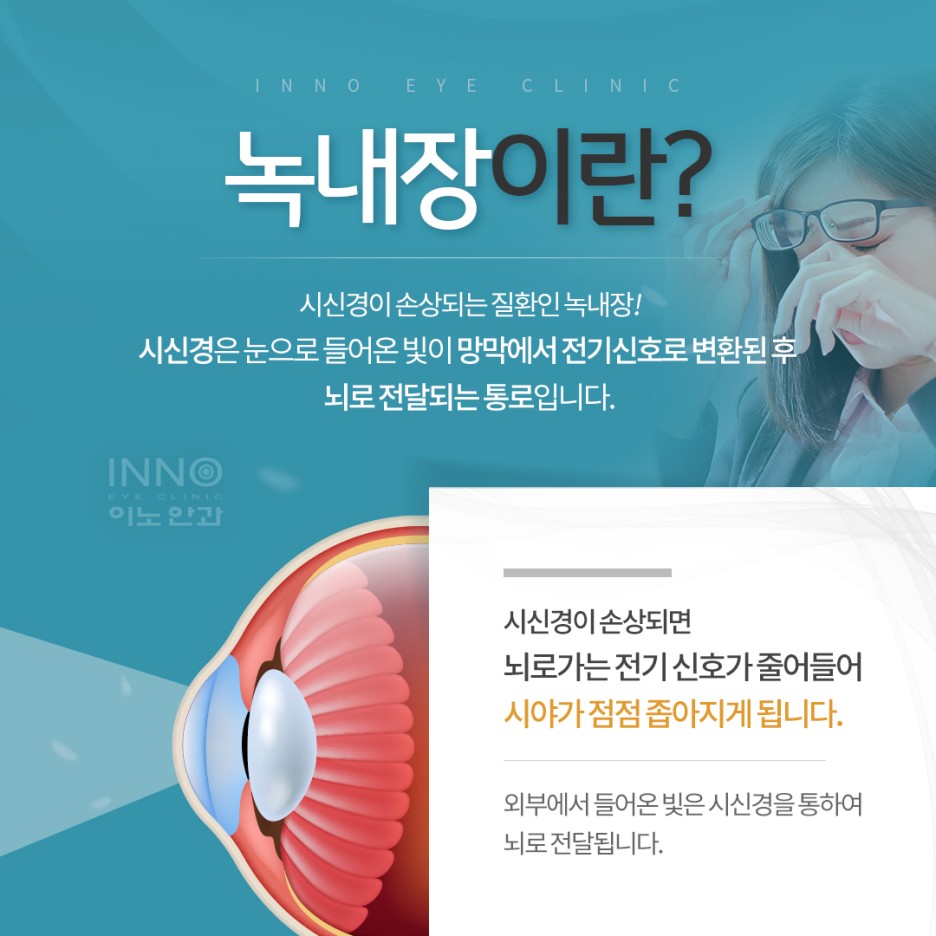 녹내장이라는 것은 혈액 순환의 문제가 생기거나 안구의 압력 상승으로 시신경 기능에 문제가 나타나는 질환입니다.