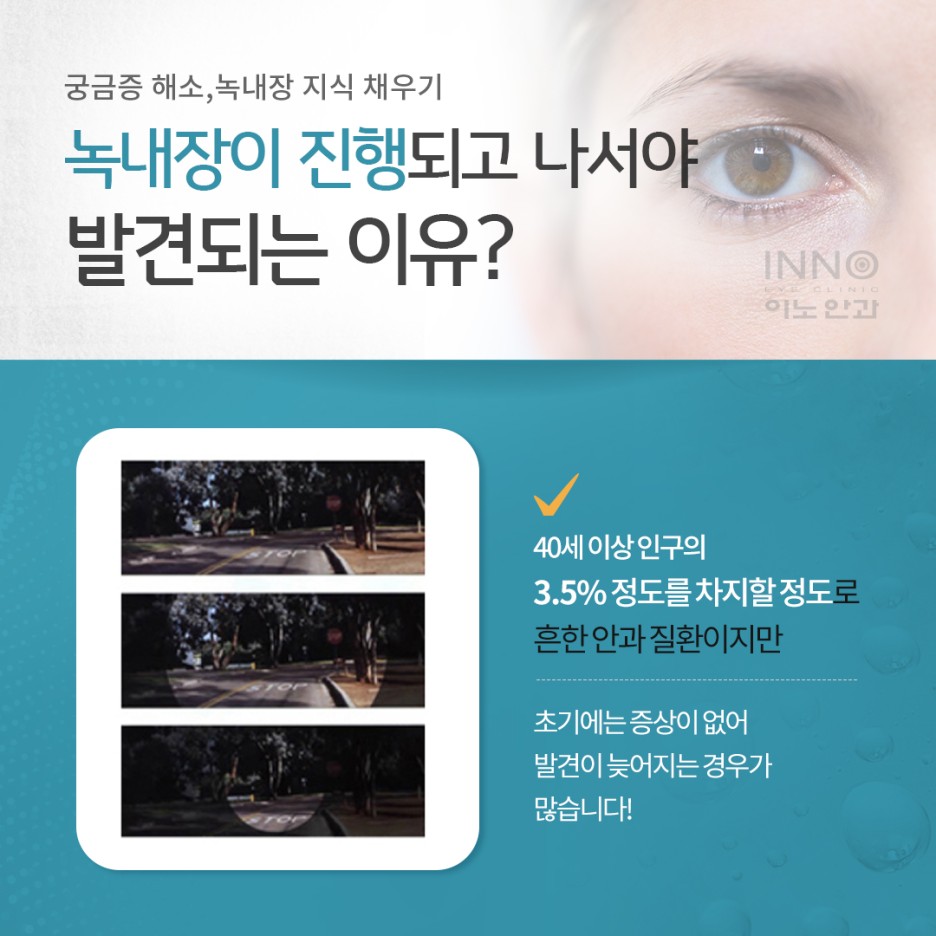 또한 안압을 기준으로 한 검진으로는 동양인에게서 흔히 볼 수 있는 녹내장은 정상 안압인 녹내장 환자의 진단이 어렵습니다.