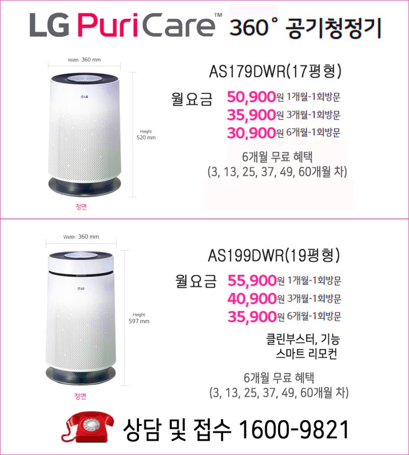 여러분도 혹시 공기청정기를 고민하신다면 렌탈에 각종 서비스, 관리 혜택까지 모두 이용하실 수 있는 LG 퓨리케어 공기청정기를 추천드립니다!