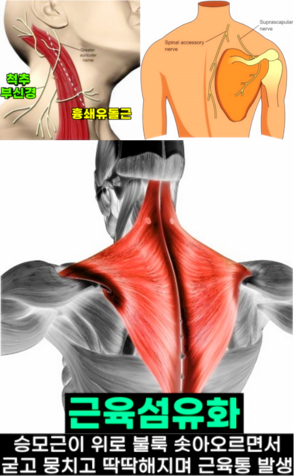 어깨 수술 효과가 없는 오십견의 원인은 뇌 산소 부족, 척추 부신경 눌림이나 자극 어깨 수술 효과가 없는 오십견을 경험하는 사람 중 많은 사람이 목이나 각전, 목 디스크 증상(목 디스크 초기 증상)을 경험한다. 이들은 두 가지 특징이 있는데 첫째, 목 근육이 뭉치고 단단해진다. 둘째, 11번 뇌신경척추부신경(accessory nerve, Nervus accessorius)이 눌려 이 신경이 분화하는 목 뒤, 어깨, 등, 우골, 팔, 손까지 통증과 저림 증상을 겪게 된다.