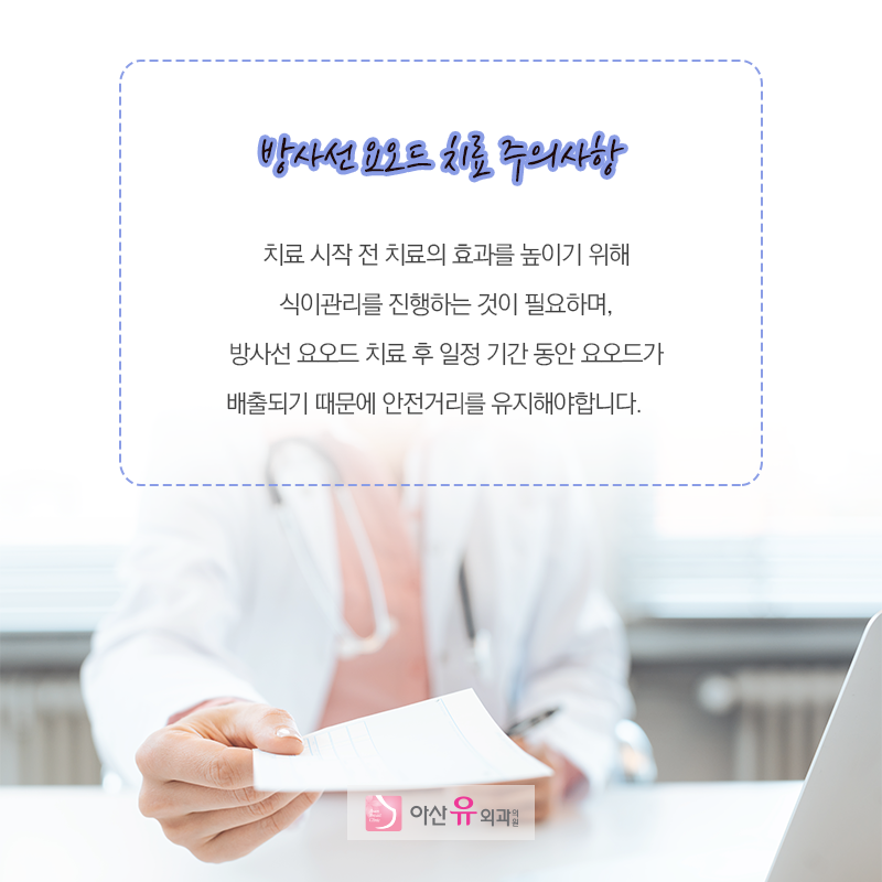 방사선 요오드 치료 주의사항 치료 시작 전에 치료 효과를 높이기 위해 2주 정도는 요오드가 적은 식단으로 식단을 진행하는 것이 필요합니다.또한 그 기간 동안 이미 먹고 있던 갑상선 호르몬을 중지해야 합니다.체내의 요오드가 적을수록 방사선을 포함한 요오드가 갑상선으로 흡수되기 쉽기 때문에, 식사 조절이나 사전 처치가 중요합니다.또한 방사선 요오드 치료를 하면 복용한 환자로부터 타액, 땀, 소변, 대변 등의 형태로 일정기간 방사선이 나오는데 인체에는 그다지 유해하지 않지만 불필요한 노출이 없도록 주위 사람과 거리를 유지해 나가야 합니다.접촉 거리와 접촉 제한 기간은 환자가 투여된 방사선 요오드의 양에 따라 달라집니다.성인은 물론, 어린이와 자고 있는 경우는 더 주의를 기울여야 합니다.국내 기준으로는 30mCi 이상의 방사선 요오드 치료를 할 경우 별도로 입원하여 격리 치료를 하고, 치료 후 주변 사람들의 방사선 피폭량이 기준치 이하일 경우 병원에서 퇴원하여 주시기 바랍니다.방사선 요오드가 배출되는 것은 복용량의 10% 이내로 영향력이 적지만 이에 대한 인지가 없는 상태를 반복적으로 노출되면 적정 수준 이상의 방사선에 노출될 수 있기 때문에 일주일 동안 주위에 노출되지 않도록 가능한 2m의 안전거리를 유지하는 것이 바람직합니다.