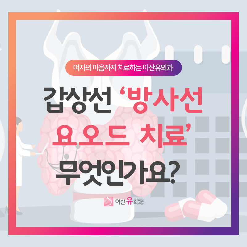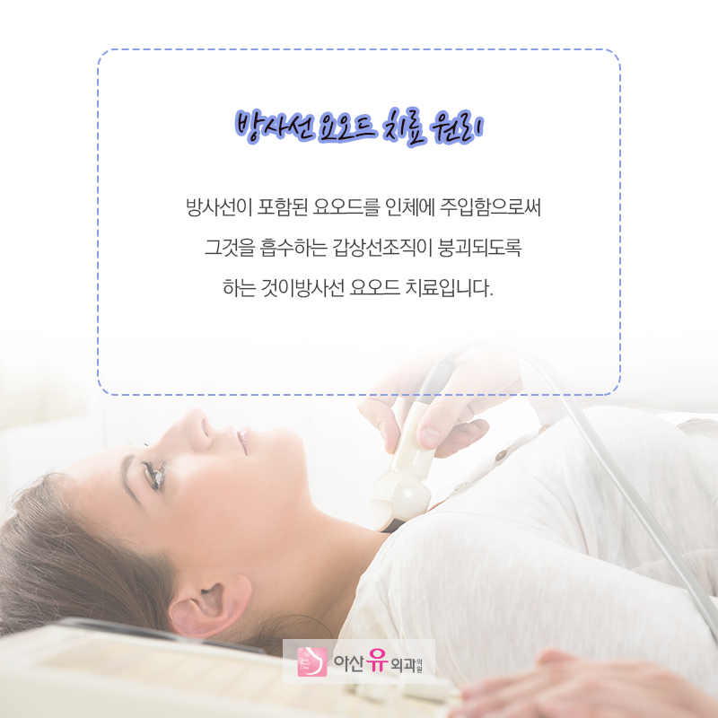 아산유외과는 서울아산병원 출신의 풍부한 경력으로 실력을 갖춘 유방 갑상선 내분비외과 전문의 (대표원장 홍수정)가 직접 진료합니다.갑상선 요오드 치료는 받는 사람의 연령, 투여량, 투여 후 경과시간, 접촉시간에 따라 달라질 수 있으므로 전문의료진과의 충분한 상담 후 시행해야 합니다. 갑상선암은 예후가 좋기 때문에 완치를 할 수 있는 암으로 알려져 있습니다. 만약 갑상선암이 의심되는 질환이 나타나면 주저하지 말고 병원을 방문하여 정확한 진단과 적절한 치료를 받아야 합니다.