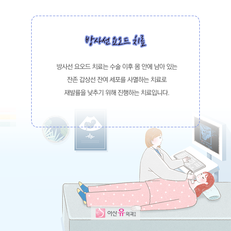 방사선 요오드 치료란?갑상선암 치료법은 한쪽 갑상선만 제거하는 잎 절제술과 양쪽 갑상선과 중간을 연결하는 협부를 제거하는 갑상선 전 절제술이 있습니다.갑상선 전 절제술을 실시하여 림프절 전이가 심하거나 주변 구조물을 침범한 경우, 암이 크거나 전신 전이가 있을 때 방사선 요오드 치료를 하게 됩니다. 방사선 요오드 치료는 수술 후 체내에 남아있는 잔존 갑상선 잔여 세포를 사멸시키는 치료로 재발률을 낮추기 위해 시행하는 치료입니다.일반적으로 갑상선암은 수술만으로 치료가 끝나는 경우가 많습니다만, 전이나 재발 위험이 높다고 판단되는 환자에게는 방사선 요오드 치료를 권장할 수 있습니다. 최근에는 갑상선 전 절제술을 해도 방사선 요오드 치료를 하지 않는 경우도 있어, 담당 선생님과 충분한 상담이 필요합니다.