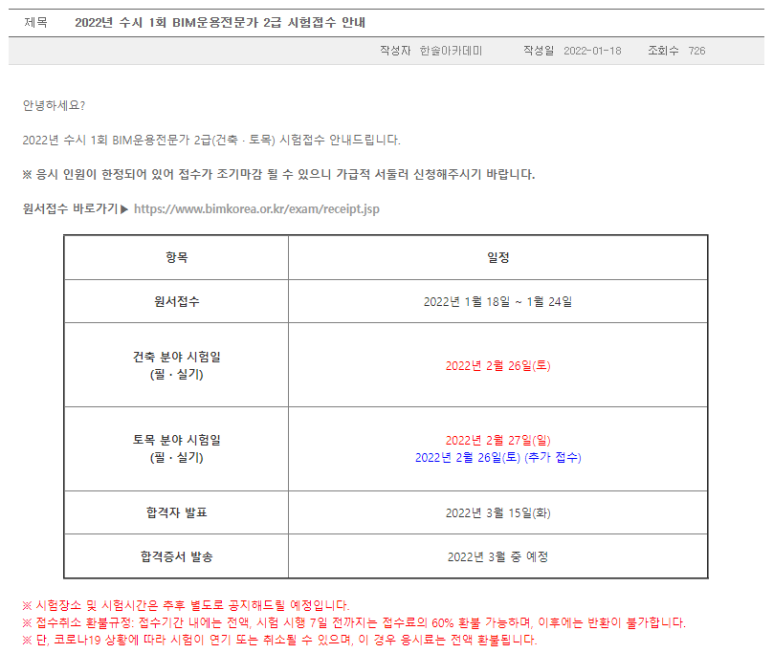 공식 한국BIM교육평가원 홈페이지 자격검정시험 일정은 1회, 2회 일정만 공지된 상태.3월이 2022년 첫 시험이라고 생각했는데, 1/18일 수시 시험 공지와 함께 바로 접수 개시.6일째인 24일에 접수 마감.인터넷 강의 없이 독학으로 BIM공부를 하던 저는 시험접수를 놓치게 되었고, 정기시험은 앞으로 필기와 실기를 나눠 치른다는 소식을 들었습니다.한 달 만에 딸 수 있었던 자격증을 3월~7월까지 길게 보고해야 하는 상황이 된 지금, 저는 과감히 드롭합니다.1월부터 교재 사서 독학하고 있었던게 아쉽지만