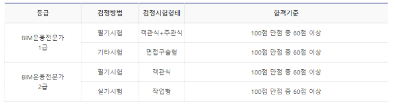 필기 및 실기 시험 모두 100점 만점에 60점 이상을 받아야 합니다.BIM 운용 전문가 1급 및 2급 필기 합격자는 발표일로부터 2년 이내에 실기시험에 재응시할 경우 필기시험을 면제합니다.한솔아카데미 및 한국BIM학회에서 주관 또는 인증하는 BIM운용전문가 관련 교육(이론+실기)을 이수하면 필기시험을 면제해 준다고 합니다.