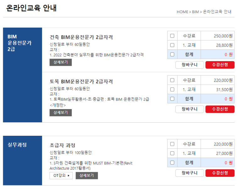 인터넷 강의는 BIM 운용 전문가 2급 자격 강의와 실무과정 강의 중 하나만 수강해도 필기 면제가 가능하오니 참고 부탁드립니다.