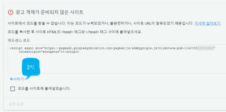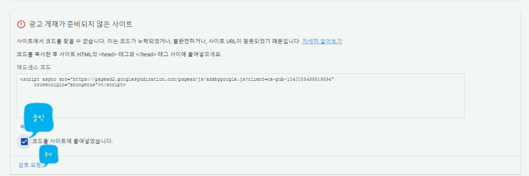 그리고 다시 구글 어드레스로 돌아가서 코드를 사이트에 붙여넣었습니다.를 클릭하시고 검토요청을 눌러주시면 OK입니다.