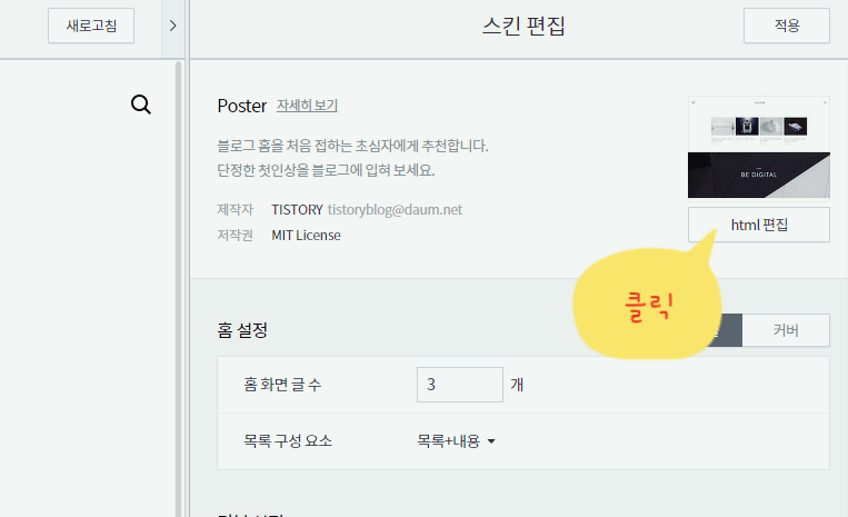 스킨 편집에서 오른쪽 상단의 html편집을 클릭합니다.