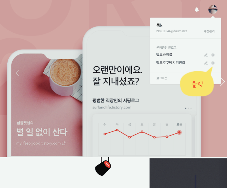 티스토리로 돌아가 그 블로그 설정(톱니바퀴)을 누릅니다.