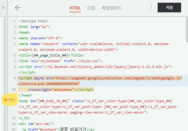 이렇게 html이 나오고 <head>와 </head> 사이에 아까 복사한 코드를 붙여넣고 적용을 누릅니다. 어떤위치가좋다라는에피소드가있는데너무신경쓰지말고헷갈리면<head>바로뒤나</head>바로앞에붙여넣으세요.