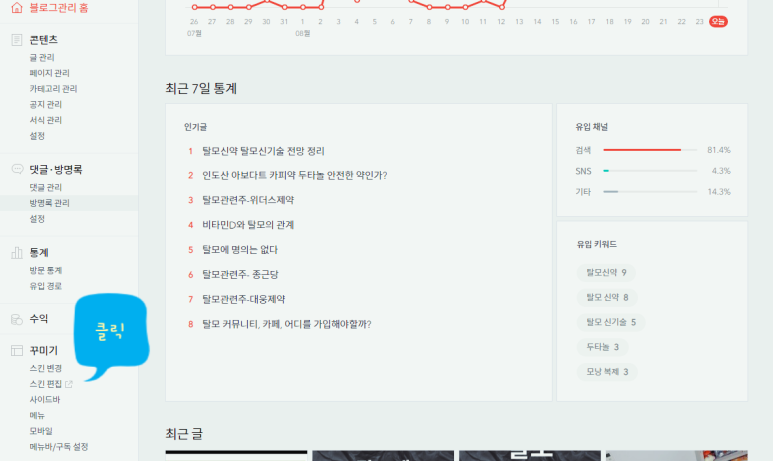왼쪽 메뉴바에서 스킨 편집을 눌러주세요.