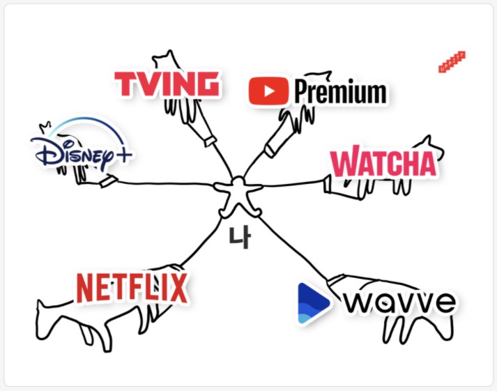 요즘 인터넷에 떠도는 O T T 구독에 대한 이미지가 저에게 깊은 공감을 주었어요 제가 누워 있는데 제 몸에 달린 O T T 서비스가 보이시나요? 넷플릭스에 디즈니플러스, 티빙, 와쳐, 웨이브, 심지어 유튜브 프리미엄까지. 마치 제 모습을 보는 것 같아요. (웃음)