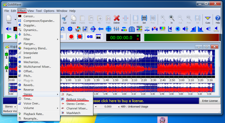 Effect의 Stereo에서 Reduce Vocals를 클릭해주세요.