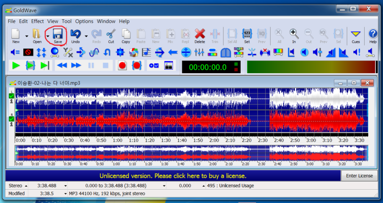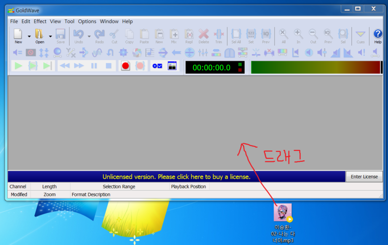 골드웨이브를 실행한 후 위와 같이 원곡 AR 파일을 골드웨이브 프로그램으로 드래그합니다.
