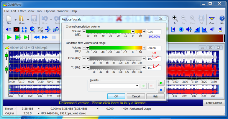 - 여자는 보통 200~250 주파수를 가지고 있다고 합니다.따라서 여성 보컬의 목소리를 제거할 때는 From(Hz)과 To(Hz)를 각각 200과 250으로 설정해주세요.