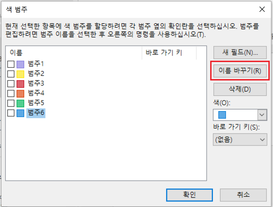 3. 색상 카테고리가 나타나면 이름을 바꾸고자 하는 색상 카테고리를 선택하고 오른쪽 [이름변경]을 선택합니다.