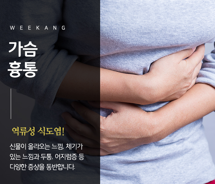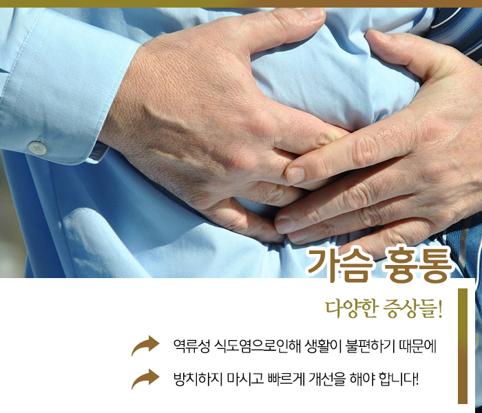 이러한 역류성 식도염의 특징 때문에 흉통을 비롯한 다양한 증상이 동반됩니다. 대표적인 것으로 시큼한 느낌이 들거나 가슴이 항상 답답합니다. 그리고 더부룩함을 느낄 수도 있고, 그 밖에도 두통이나 어지러움을 동반할 수도 있습니다.