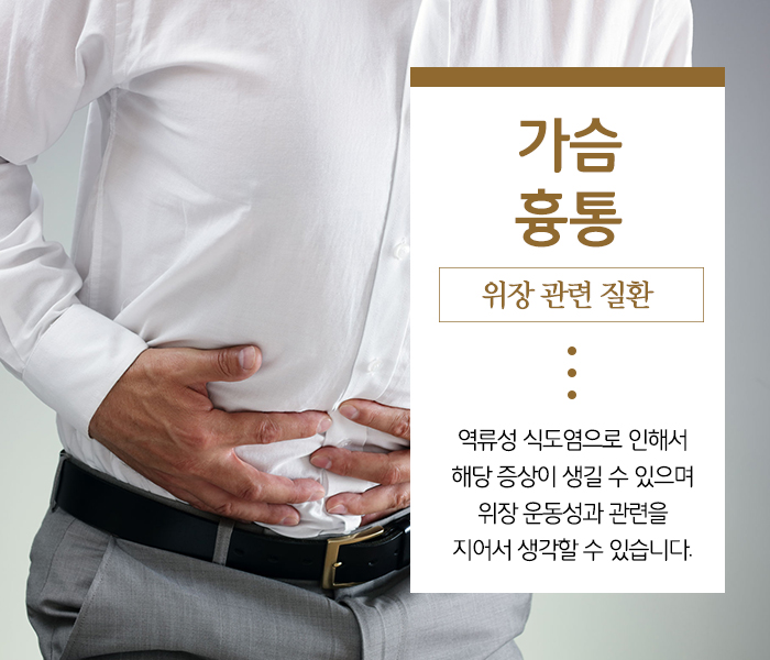 앞에서 설명한 것으로 가슴의 통증이 나타날 수 있지만, 그 외에도 우리가 소화기 관련 질환을 가지고 있는 경우에 증상이 나타날 수 있습니다. 대표적으로 이 증상이 나타나면 역류성 식도염을 의심해 볼 필요가 있습니다.