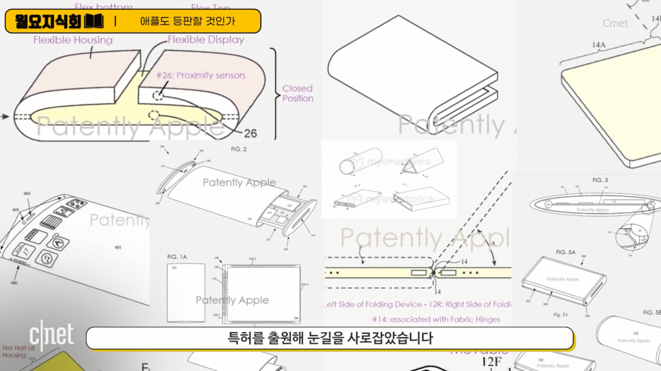 따라서 많은 전문가들은 애플이 폴더블 시장에 진입하는 순간 판도가 바뀔 것으로 예상하고 있습니다. 처음에는 스마트폰의 시장성에 회의적이었는데 요즘은 분위기가 좀 달라요. 아직 공식적인 발표는 없지만 2016년부터 꾸준히 휴대용 폰 관련 특허를 출원해 왔습니다. 특히 배터리를 힌지, 즉 경첩과 함께 접을 수 있는 특허를 받은 적도 있는데, 이는 배터리 셀을 두 개로 분리한 삼성의 휴대용 폰과는 조금 다른 형태입니다. 단순히 배터리 탑재 공간을 추가 확보하는 것뿐만 아니라 기기를 유연하게 디자인하기 위해서라고 합니다.