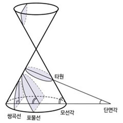 단면각 <모선각—>타원단면각=모선각=포물선단면각>모선각—>쌍곡선