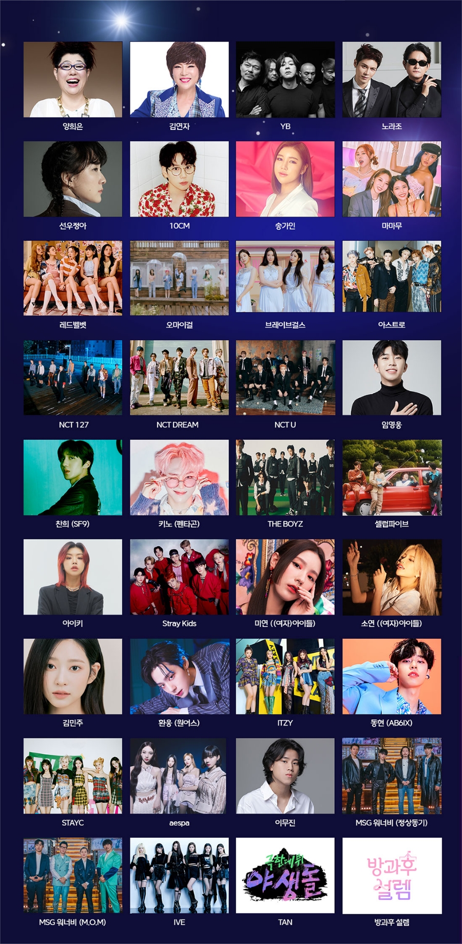 마마무, 레드벨벳, 오마이걸, 브레이브걸스, 아스트로, NCT 127, NCT DREAM, NCT U, THE BOYZ, Stray Kids, ITZY, STAYC, 에스파(aespa), 이무진, 아이브(IVE) 등