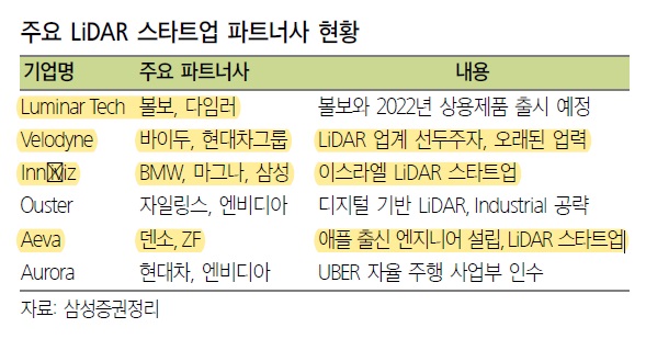 4. 투자전략 : 속도와 실현가능성 주목 – LiDAR 업계는 스타트업 및 Valeo와 같은 자동차 부품회사까지 뛰어들어 경쟁강도가 높아지고 있다 – 그러나 글로벌 차량부품시장의 강자인 덴소와 마그나 등이 LiDAR 스타트업과 협력관계를 유지하고 있는 상황을 고려할 때 아직 승기는 LiDAR 업체로 하여금 LiDAR 업체로 하여금 LiDAR 스타트업과 협력관계를 유지하도록 하는 상황.고, M&A 가능성까지 고려할 때 투자 판단에 중요한 포인트임 – 양산 가능성에 있어서는 Velodyne LiDAR(VLDR, 벨로다인라이더) 비교 우위: 지난 10년간 905nm 대역기술을 활용하여 약 5만개의 납품 경험을 보유. 진행 중인 175개 프로젝트도 신뢰도를 높이는 요인 – 잠재성과 파트너사 신뢰도에 있어서는 Luminar Technologies(LAZR, 루미나) 비교 우위 : Volvo와의 협력으로 2022년 상용화를 눈앞에 두고 있으며 상당 부분 양산에 진척된 것으로 예상, 전통 기업과는 다른 접근법으로 구현한 LiDAR 20년 매출의 불확실성 역시 경쟁력이 될 것이다 – 만성적 인데이를 위한 제품들을 아우르고 있다 – 만성적 성과 20년 상용화를 위한 제품들