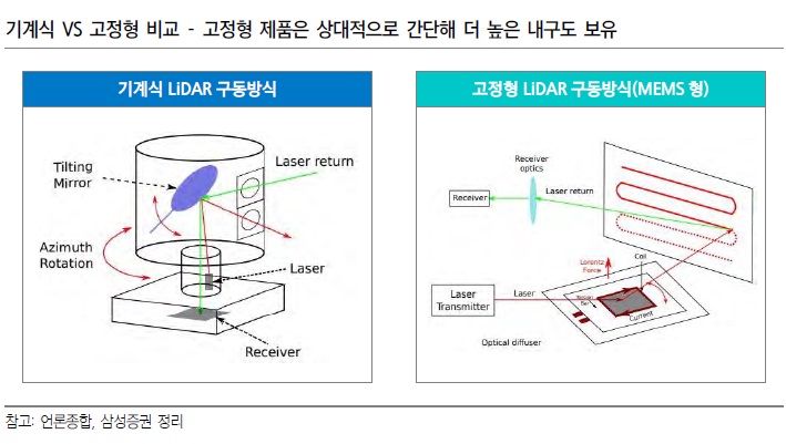2. LiDAR 주요 기술이슈 – LiDAR 업계는 산업 초기인 만큼 표준화된 기술이 없으며, 각 업체별 개발 속도 및 원천 기술 등 구현 방식이 다르다 – 주요 이슈는 다음 세 가지로, 구현 방식에 따라 시장의 승자가 갈릴 것으로 예상되는 1) 회전형(기계식) VS 고정형(Solid 1대로 360도 시야를 모두 확보할 수 있다는 장점이 있지만 기계 구성이 복잡해 기술오류 발생 가능성이 높다. 진동에 민감하고 좌우 상하 진동이 잦은 차량에 적합하지 않음.- 고정형 : 회전형 대안, 반도체에 사용되는 MEMS(초소형 정밀기계기술, Micro-Electro Mechanical Systems) 기술 등을 활용하여 회전기계 부품이 존재하지 않아 상대적으로 구성이 쉽고 내구성이 회전형보다 우수함