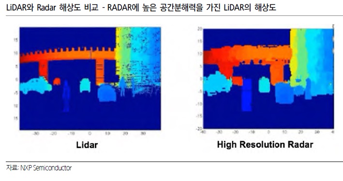 2) LiDAR의 장점 – 단일 감각만큼 오감활용 정보 정확도가 높은 것처럼 카메라, RADAR(레이더) 그리고 LiDAR까지 결합된 ADAS 안정성이 높음 – 현재 양산되고 있는 카메라와 RADAR 결합한 ADAS 시스템은 공간 분해능, 특정 환경에서의 오작동이슈 있음 – 테슬라와 같은 빅 데이터는 공간 분해능 오작동 이슈 있음. 실제로 테슬라 오토 파일럿 모드에서 터널 혹은 다리 밑을 지날 때(갑작스러운 그림자 발생), 팬텀 브레이크와 갑작스런 브레이크 현상이 자주 발생. 이는 카메라를 통한 물체 인식의 한계성을 보여주는 사례로 그림자에 큰 영향을 받지 않는 LiDAR가 이를 보완할 수 있어 보다 안정적인 시스템 구축이 가능.