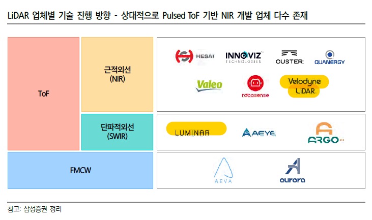 3) Pulsed ToF(Time of Flight) VS FMCW(Frequent Modulated Continuous Wave) – 대부분의 기업은 Pulsed ToF 방식 LiDAR 방식 LiDAR 개발-Pulsed ToF 방식: 방출되는 레이저 왕복 시간 측정 거리 그러나, Pulsed ToF에 비해 데이터의 복잡성이 높고, 초기 기술이기 때문에 성숙도가 낮다.