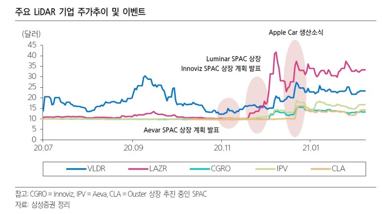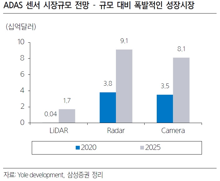 삼성증권: 라이더-LiDAR(라이더) : 자율주행의 눈(2021년 2월 보고서) 1. 라이더(LiDAR) 성장 가능성 1) 자율주행과 LiDAR(Light Detection and Ranging)은 1960년대에 개발된 기술과 2017년 구글웨이모 차량이 LiDAR 센서를 탑재하면서 높은 LiDAR(LiDAR)의 주요 차량에 대한 관심도를 부여받아 시작하게 되는 주요 Makevel-Madear, Contradearching)은 1960년대에 개발되었으며, Makechernection 주요 Make Unection Darchernection 이유로서 LiDAR의 필요성은 업계로부터 제기되어 다수의 스타트업이 1,000달러 미만의 공격적 가격 하락을 제시하여, 다시 상용화에 대한 기대가 높아진다-결정적으로 다시 LiDAR에 대한 주목의 계기는, 애플의 아이폰, iPad에 LiDAR 스캐너를 탑재해 온 것을 고려하여, 차량에도 LiDAR 20DAR 활용 가능성이 높다-애플의 전기 자동차가 자율 주행이라고 하는 것을 고려.유 : 자율주행데이터에 있는 – 테슬라는 2015년부터 30억 마일 이상 자율주행데이터를 축적하여 카메라와 레이더 기반의 약점을 머신러닝을 통해 소프트웨어로 극복하는 전략 – 애플 및 후발주자의 완성차 업체 대부분은 빅데이터 기반을 따라잡기가 쉽지 않으며, 이 차이를 극복하기 위해 LiDAR을 포함한 튼튼한 하드웨어 라인업이 필요