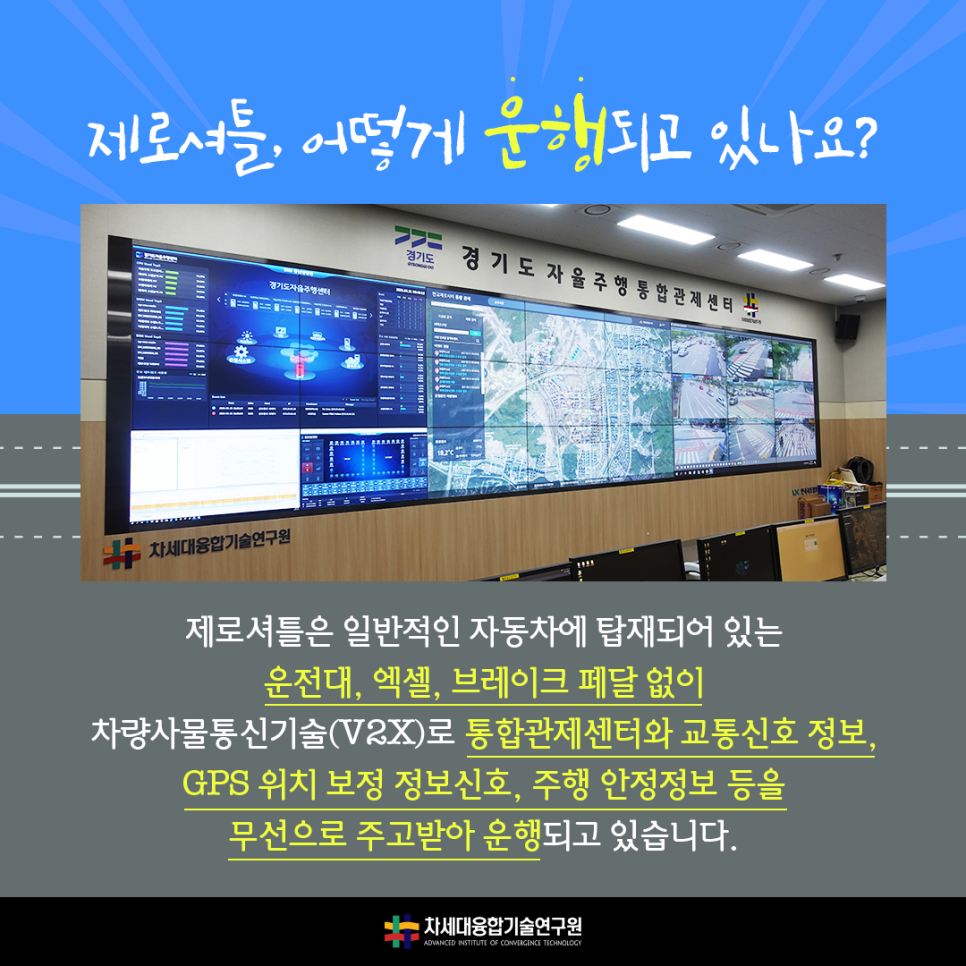 왜 판교에서만 운행하세요제로 셔틀이 운행되고 있는 판교 제로시티는 국내 최초로 실제 도로 기반 데이터를 수집할 수 있으며, 자율주행을 위한 통합 관제센터 및 IoT 서비스 인프라가 구축된 스마트 시티이므로 안전한 테스트가 가능합니다.