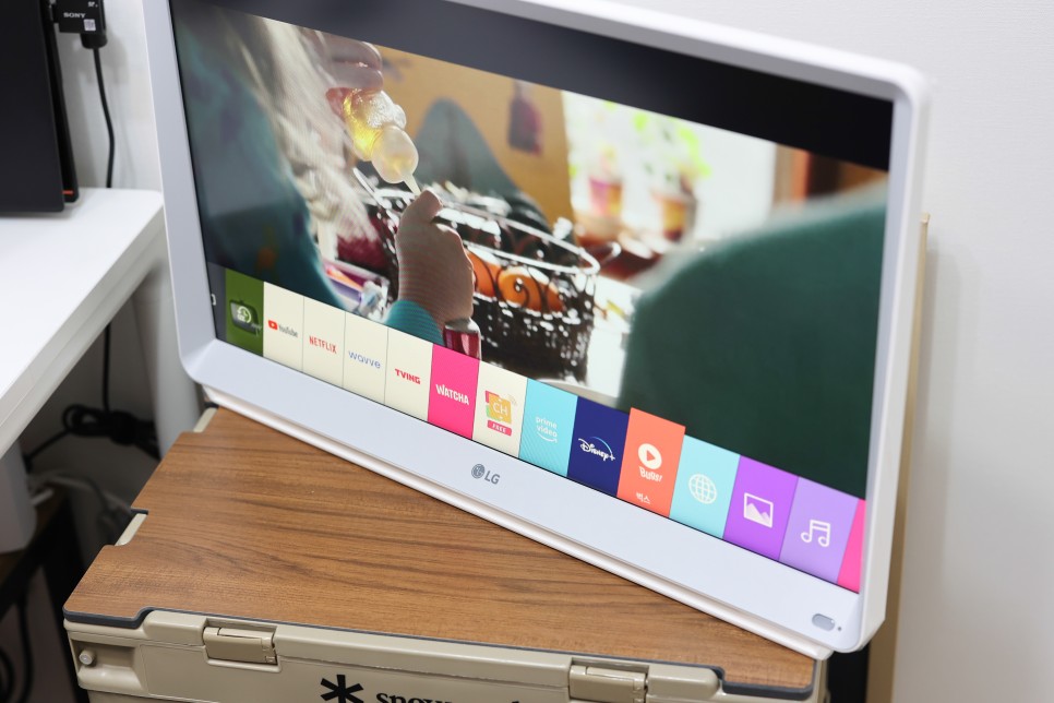 지금은 겨울철이기 때문에 아직 캠핑장에서 사용을 안 하고 있습니다 목적은 캠핑이지만, 집에 도착한 이후로는 제 책상 옆에 두고 사용하고 있습니다. LG 룸앤TV의 27인치 모델은 28인치에 비해 깔끔한 디자인과 FHD 해상도를 가지고 있어 다양한 영상을 시청하기에 충분합니다. 물론 일반 TV에 비하면 느린 속도는 여전히 답답하지만 그 정도는 LG라는 브랜드를 믿고 참을 수 있잖아요.