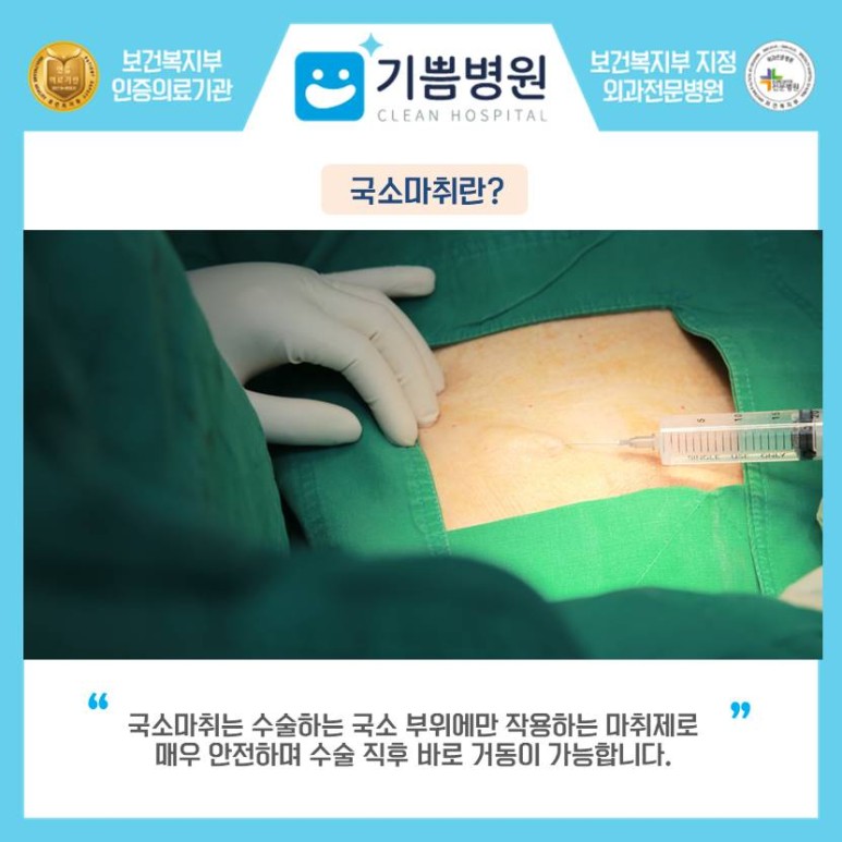 기쁨병원의 무인공망 탈장수술은 인공망을 사용하지 않고 최소절개로 수술을 하기 때문에 수술할 국소부위에만 마취를 하는 국소마취를 시행하고 있습니다. 국소마취는 마취 후유증이나 뇌 기능에 영향을 주지 않아 어린이, 고령자, 기저질환이 있는 분 등 남녀노소가 재발률이나 합병증에 대해 안심하고 수술을 받을 수 있습니다.