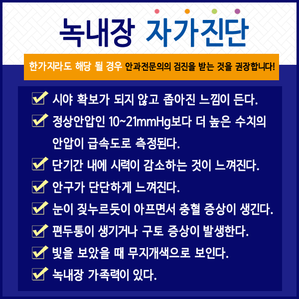 녹내장 자가진단 첫 번째는 시야 확보가 안 돼 좋아진 느낌이 든다.② 정상 안압인 10~21mmHg보다 높은 수치의 안압이 급속하게 측정된다.③단기간에 시력이 감소하는 것이 느껴진다. ④번안구가 딱딱하게 느껴진다.편두통이 생기거나 구토 증상이 발생한다.녹내장 가족력이 있다.