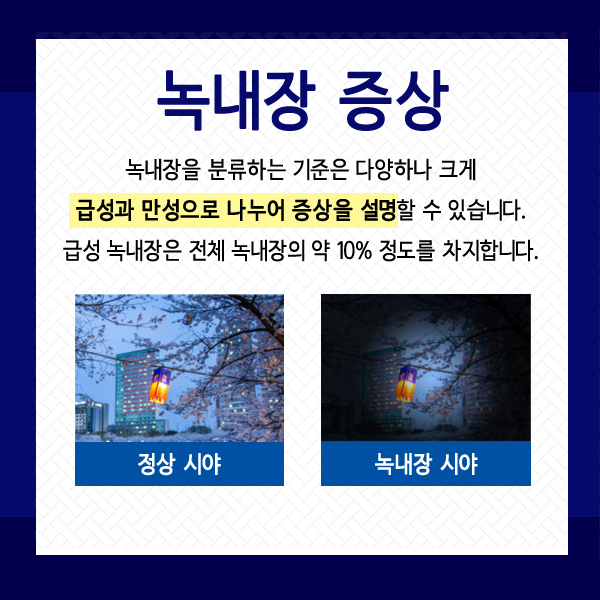 실명안과 질환인 만큼 주기적으로 검진을 통해 미리 녹내장을 예방하는 것이 중요합니다.