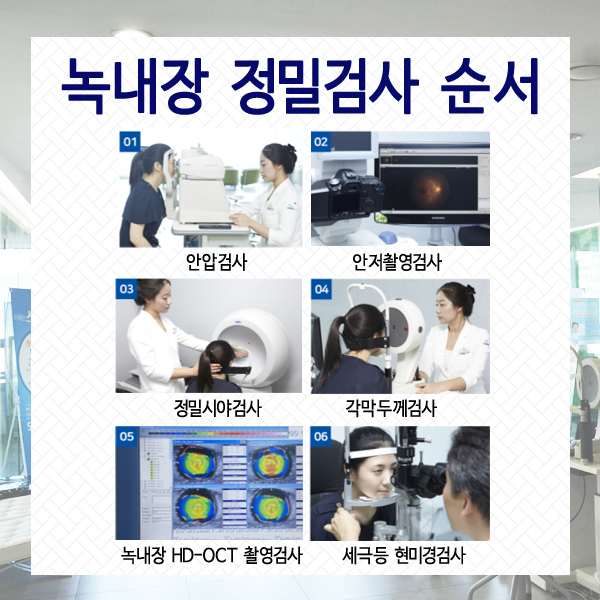 ▲ 녹내장 정밀검사 순서 = 녹내장 진단 및 치료를 위한 장치인 OCT, Humpphry 시야 검사계, 시신경 섬유층 특수촬영 카메라, IOLMater 등 첨단 장비를 바탕으로 질환의 진행 여부를 통합 검사합니다.