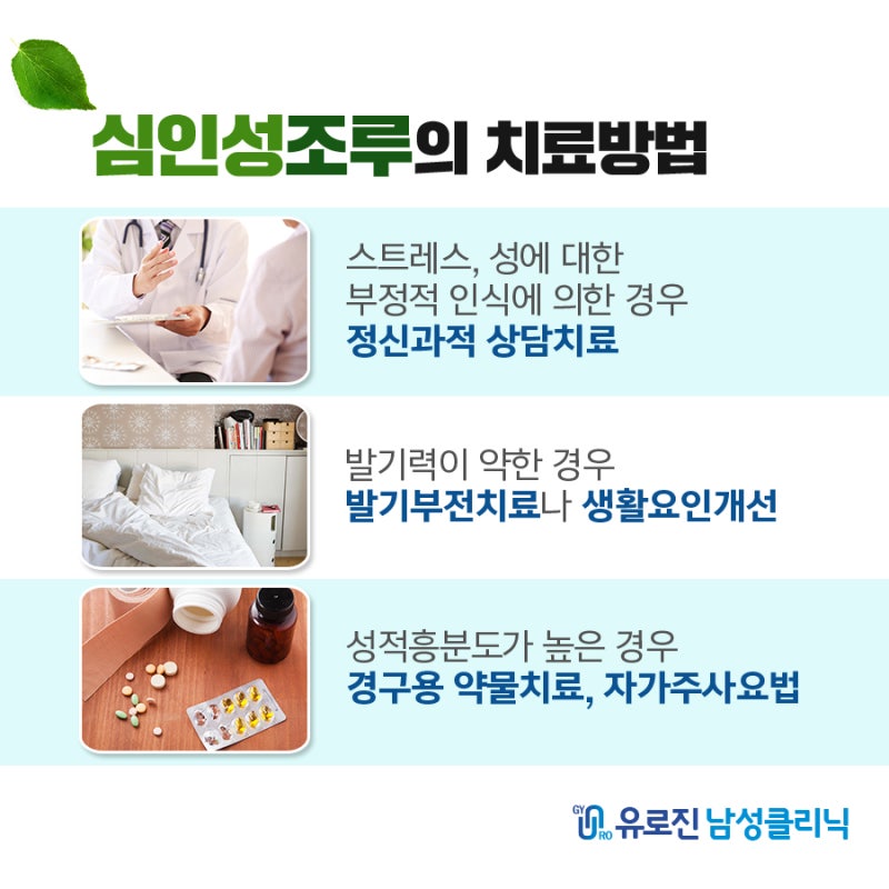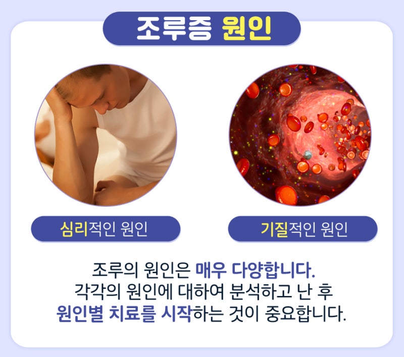 남성에게서 흔히 볼 수 있는 비뇨기과 질환이 조루증입니다. 이는 이성을 만나는 데 큰 장애요인으로 꼽힙니다. 성관계 시 남성은 물론 파트너도 충분한 만족감을 느끼기 어려워 자존감이 무너지기 쉽습니다. 조루증은 흔히 심인성 조루와 과민성 조루로 구분합니다. 심인성 요새는 심리적인 요소에 영향을 받아 사정 조절 능력이 저하되어 있습니다. 이런 경우 과거 성관계에서의 트라우마, 스트레스, 불안, 강박 등의 다양한 원인이 있을 수 있습니다.