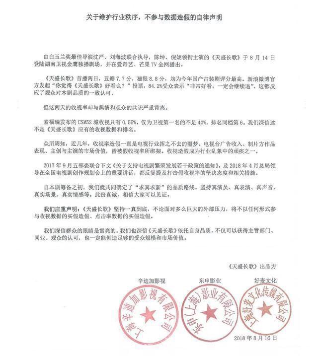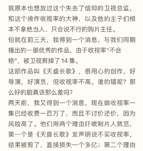 이틀 전에는 또 다른 소식을 들었다. 현재 시청률 1회당 이미 비용을 100만위안으로 놓고 흥정도 하지 않고 있다. 위험도가 높다는 이유였다. 이들은 두 가지 이유를 들어 제작자를 협박했다. 천성장가가 시청률을 사지 않겠다는 성명을 냈지만 결국 (방송회가) 잘려 직접적으로 1억대의 손실을 입었다.