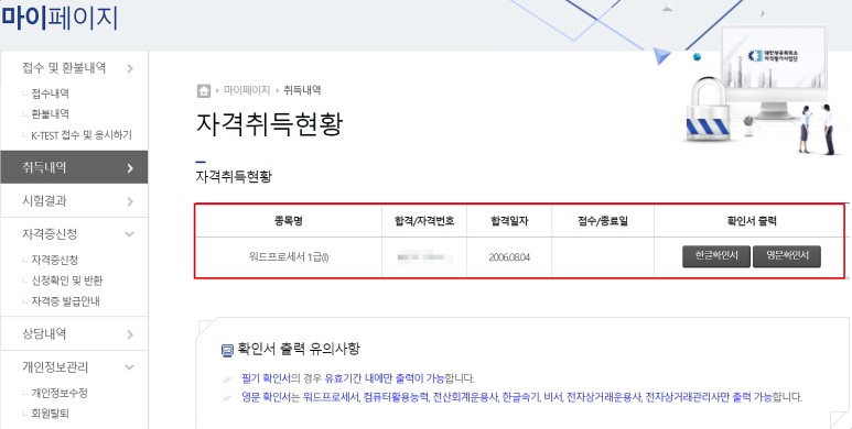 로그인하면 자격증 취득현황이 나오는데, 저는 워드프로세서 자격증이 하나 있고 종목명, 합격/자격번호, 합격일자 등을 확인할 수 있어요.