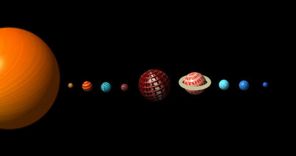 태양계 행성의 이미지 실제 거리에서 나열하기에는 너무 멀리 떨어져 있어서 일반 모니터나 종이 등으로 나타낼 수 없다.