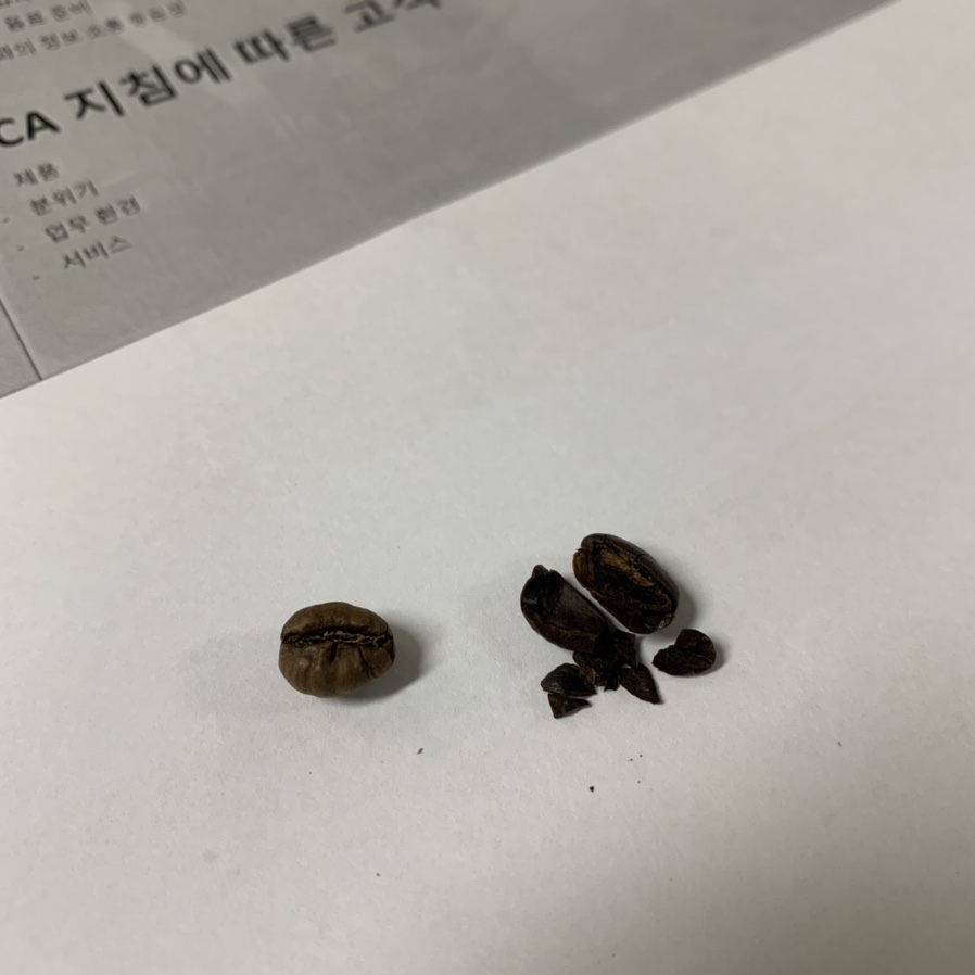 로스팅 안 된 거랑 다크로스팅 안 된 거랑 다르게!이렇게 수분이 날아가고 다크 로스팅은 밀집력이 약하기 때문에 손으로 콩을 누르면 바로 이렇게 망가집니다.