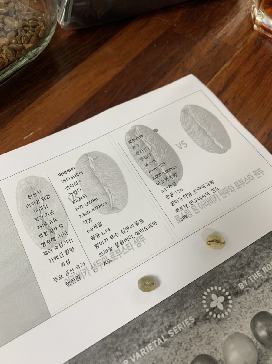첫 수업인 만큼 이론 수업으로 진행되었고, 커피 종류, 로스팅별로 다른 커피를 만져보거나 그동안 궁금했던 점들이 많이 해소된 것 같아요!