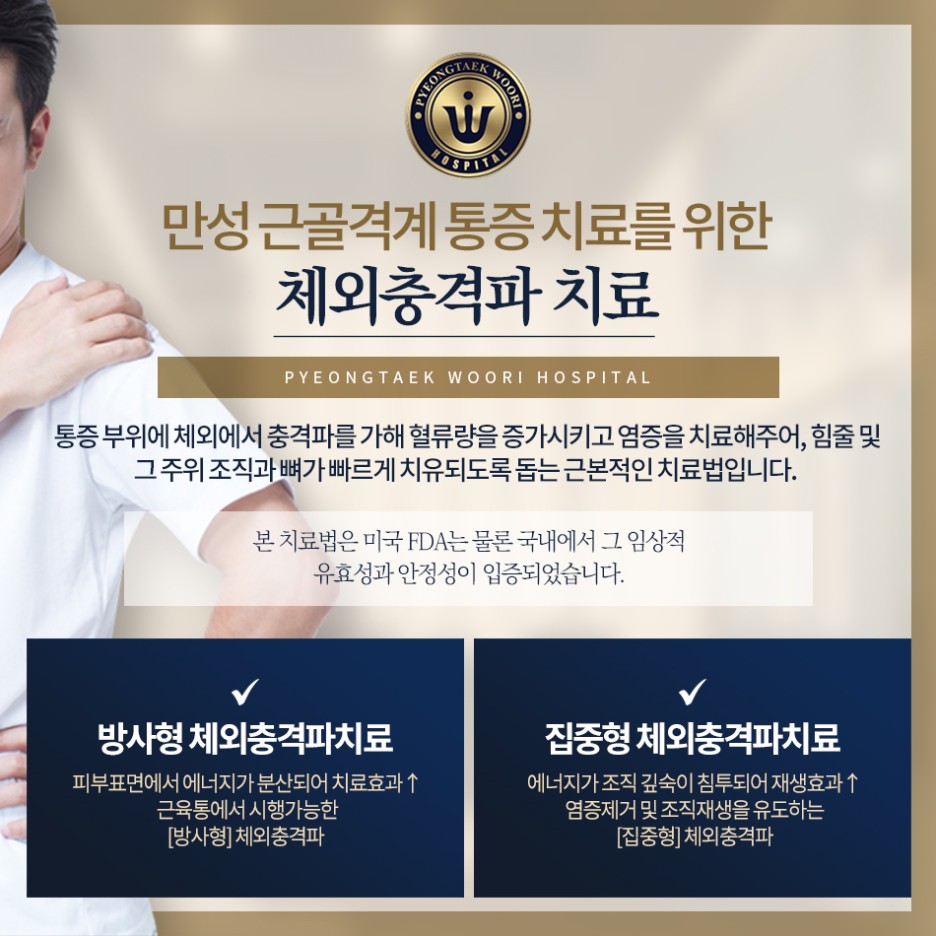 만성 근골격계 통증 치료를 위한 체외충격파 치료 체외충격파는 체외로 충격을 주고 혈류량을 증가시키며 염증을 치료하여 조직 재생을 촉진하는 대표적인 비수술 치료법입니다.