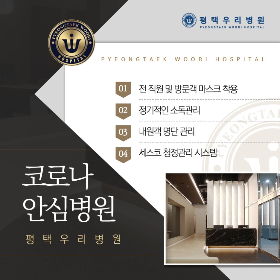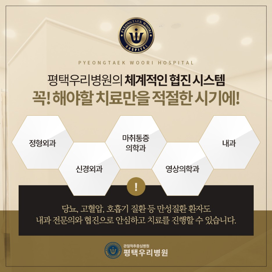 수술도 잘하고 비수술도 잘하는 평택 우리병원, 본원은 무조건 수술을 권하지 않고 현재 상태를 정밀하게 검사 평가하여 꼭 필요한 치료를 제안하고 있습니다.