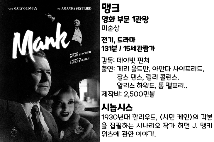 <맨크>(2020)는 데이비드 핀처 감독이 2003년에 사망한 자신의 아버지 잭 핀처가 1990년대에 완성한 시나리오를 바탕으로 연출한 작품이다.
