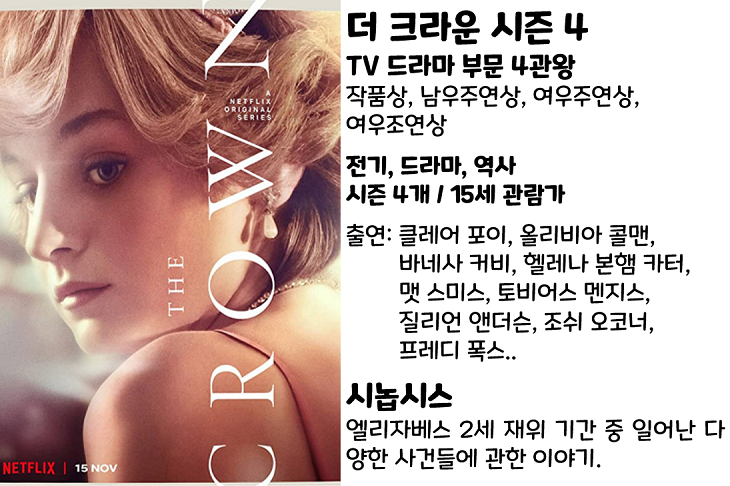 시즌 4부터 다이애나비가 등장하여 <더 크라운> 시리즈 역대 최고 시청자 수를 기록한 것으로 알려진 <더 크라운 시즌 4>는 골든 글로브 시상식에서도 크리틱스 초이스 시상식과 같은 부문에서 수상에 성공하며 4관왕에 올랐습니다.