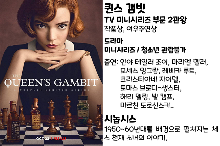 넷플릭스 오리지널 미니시리즈 최다 시청 기록(※6,200만 가구)을 가진 『퀸스 갬빗』(2020)은 골든 글로브 시상식에서 미니시리즈 부문 작품상과 여우주연상을 수상했습니다.