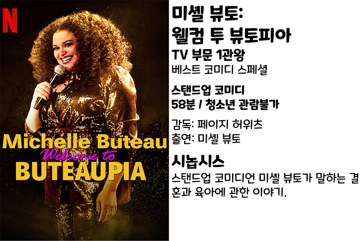 <미셸 뷰트:웰 컴 투 뷰토피아>(2020)는 스탠드업 코미디언 미셸 뷰트가 백인 남편과의 인종간 결혼, 그리고 대리모를 통해 얻은 쌍둥이 자녀 등을 주제로 이야기를 나누는 작품입니다.