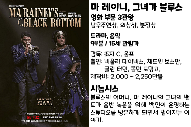 “작년 8월 대장암 투병 끝에 사망한 고 채드윅 보스만의 유작 <말레이니, 그녀가 블루스>(2020)는 남우주연상, 분장상, 의상상을 수상하며 3관왕을 차지했습니다”오늘은 지난 18일 넷플릭스를 통해 공개된 고 채드윅 보스만(1976~2020)의 유작 ‘말레이니, 그녀가 불…’ blog.naver.com ‘채드윅 보스먼’은 골든 글로브 시상식에 이어 ‘크리틱스 초이스’ 시상식에서도 남우주연상을 수상함으로써 아카데미 시상식에서도 남우주연상을 수상할 가능성이 매우 높아지고 있는 상황입니다.