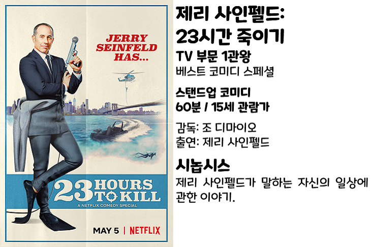 <제리 사인펠드: 2 3시간 죽이기>(2020)는 1980~90년대에 유명했던 NBC 시트콤 <사인펠드>의 창작자로 유명한 스탠드업 코미디언 제리 사인펠드가 출연한 작품입니다.